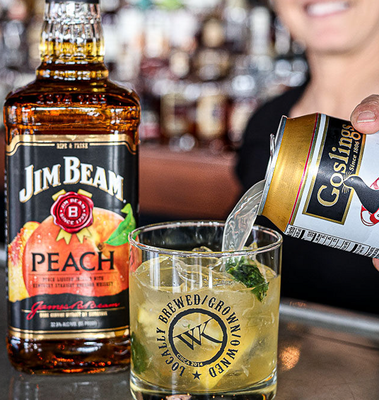 Jim Beam Peach Bourbon Whiskey, ginger beer, soda splash, fresh Pressed basil & lemon